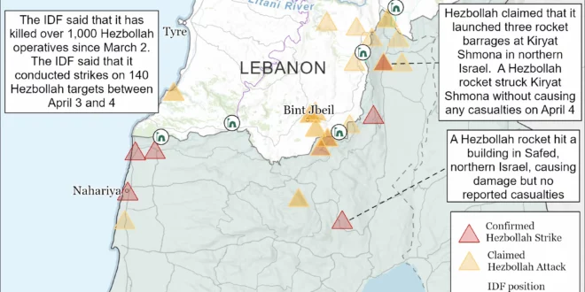 The IDF has continued to strike Hezbollah-affiliated sites and personnel throughout Lebanon. The IDF reported that it has killed over 1,000 Hezbollah operatives since the start of the Israeli campaign in Lebanon on March 2.[54] The IDF also said that it conducted strikes on 140 Hezbollah targets between April 3 and April 4.[55] The IDF reported that it struck an IRGC Quds Force Lebanon Corps headquarters in Beirut on April 3.[56] The IDF stated that the Lebanon Corps serves as a link between Hezbollah and Iran and is aiding Hezbollah’s reconstitution.[57] The IDF previously killed IRGC Quds Force Lebanon Corps commanders in airstrikes in Beirut on March 3 and 7.[58] The IDF also struck two Palestinian Islamic Jihad (PIJ) headquarters in Beirut on April 3.[59] The IDF said that senior PIJ members coordinated attacks against Israel with Hezbollah at these headquarters.[60] The IDF also struck a rocket launcher on April 3 that Hezbollah previously used to launch rockets at northern Israel.[61]