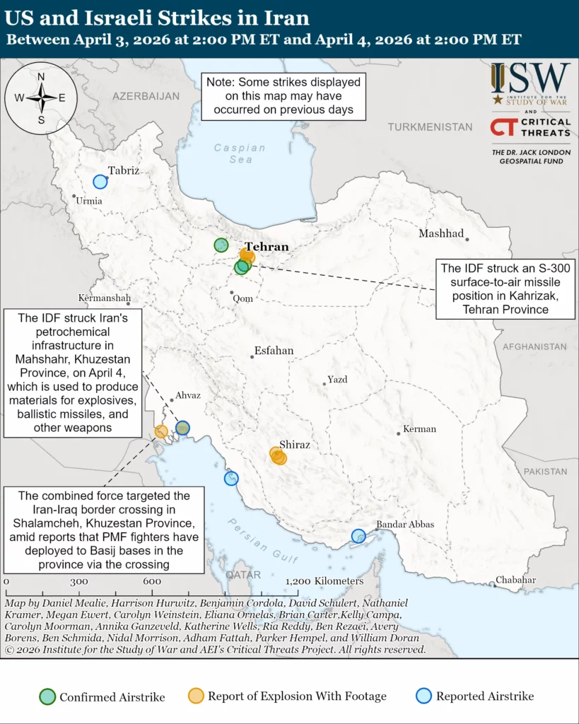 The combined force has continued to degrade Iranian air defense capabilities to maintain air dominance in Iran. The IDF struck an S-300 surface-to-air (SAM) air defense site in Kahrizak, Tehran Province, on April 4.[12] It is unclear what part of the site the IDF struck. An S-300 battery consists of engagement and detection radars, command-and-control centers, fire-control units, and launchers to operate as a functional SAM system.[13] Israel previously rendered Iran’s three remaining S-300 systems combat ineffective in October 2024 by destroying their TOMBSTONE radars.[14] Iran reportedly paired S-300 systems with domestic radars sometime after October 2024.[15]