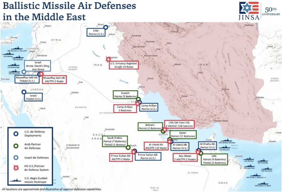 «La plupart des bases, ports et villes du Golfe se situent à proximité des zones de lancement iraniennes, ce qui réduit le temps dont disposent les forces de défense pour détecter, suivre et neutraliser les menaces. Les missiles balistiques iraniens lancés vers le Koweït, Bahreïn, le Qatar ou les Émirats arabes unis peuvent atteindre leurs cibles en trois à dix minutes, soit une fraction du temps déjà très court de 12 à 15 minutes nécessaire aux missiles balistiques pour atteindre Israël».