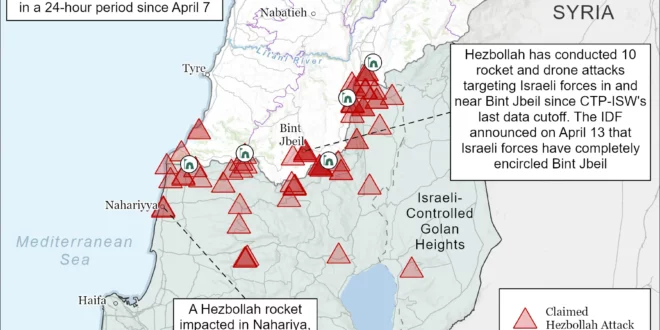 Hezbollah claimed that it has conducted 19 attacks targeting Israeli forces in southern Lebanon since CTP-ISW’s last data cutoff on April 12.[58] Hezbollah claimed 10 rocket and drone attacks targeting IDF forces in Bint Jbeil and surrounding villages amid the IDF’s isolation of and advance into Bint Jbeil on April 13.[59] An Israeli military correspondent reported that a Hezbollah drone attack wounded eight IDF personnel in southern Lebanon on April 13.[60]