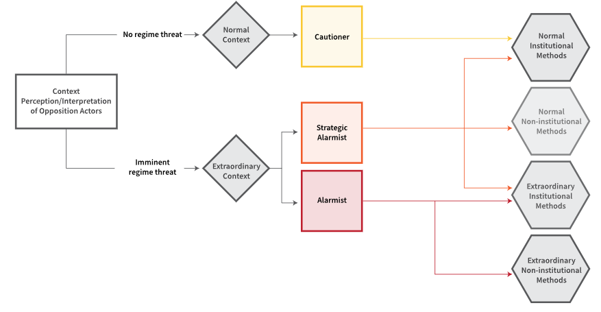 Strategic alarmists see a regime threat to democracy and think that regime defense should be the opposition’s goal; nevertheless, they think that opposition actors should engage as much as possible in normal politics for strategic reasons, such as their assessment of power balances, the hardship of convincing a diverse and imperfectly informed citizenry and their credibility with the public and international actors. Thus, they consider methods in boxes A, B and C in table 1. They eschew extraordinary non-institutional methods (box D).