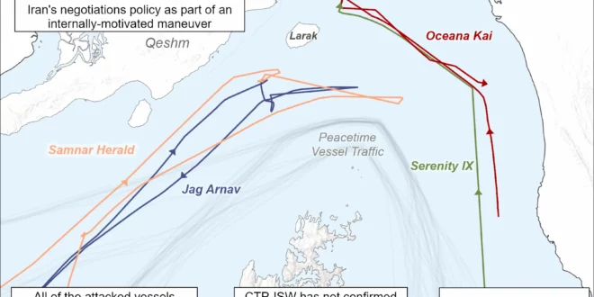 The IRGC Navy likely used fast attack craft to attack and intimidate at least four vessels in order to deter vessels from transiting the strait on April 18.[26] All of the attacked vessels appear to have been transiting along the Iran-imposed traffic separation route that forces ships through Iranian territorial waters at the time of the attacks.[27] IRGC Navy “gunboats” fired on a likely Indian-flagged tanker east of Larak Island, and “unknown projectiles” struck a likely Iranian-flagged container ship in the same area.[28] Reuters also reported that two vessels reported being struck by gunfire between Qeshm and Larak islands.[29] All four vessels turned around.[30] The IRGC also broadcasted radio messages to vessels in the strait, warning them that the strait is “closed.”[31] Numerous vessels traveling toward the strait turned around after the Iranian attacks, according to maritime tracking data.