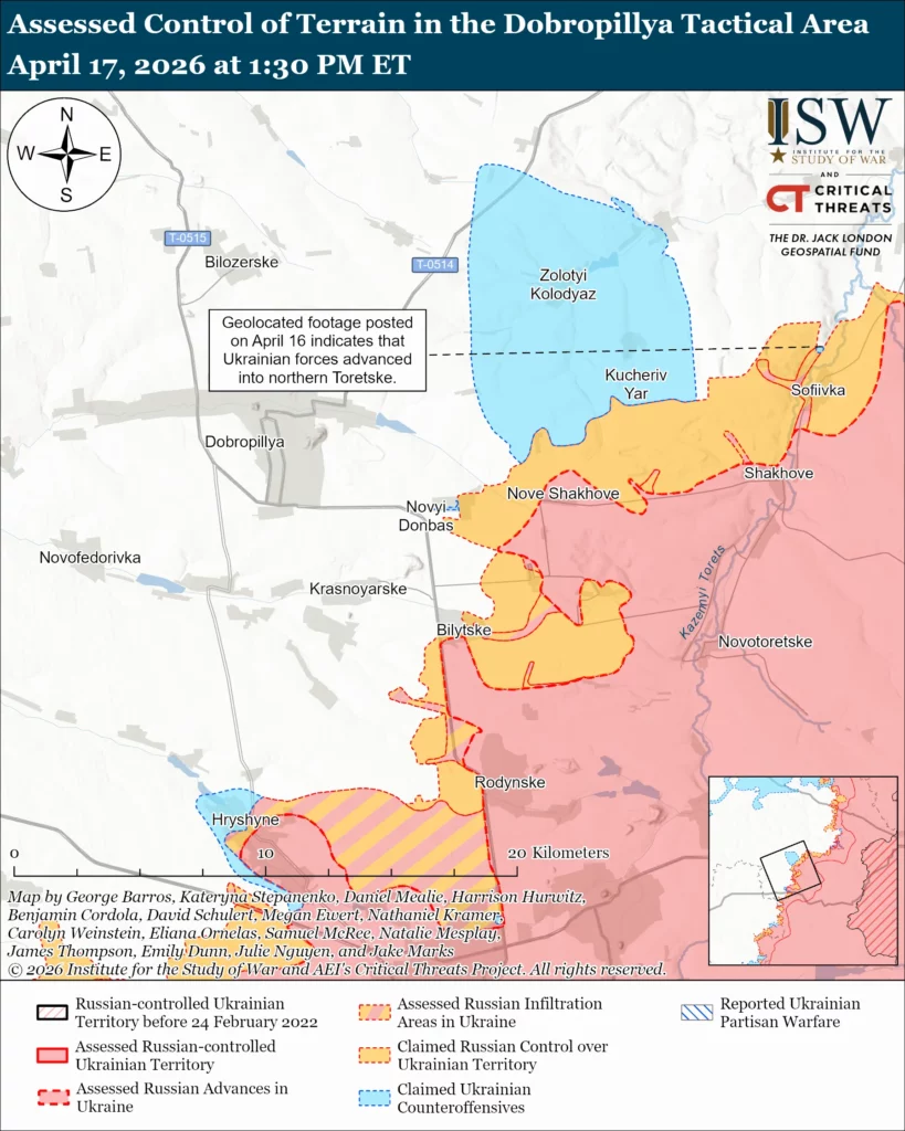 Ukrainian forces recently advanced in the Dobropillya direction. Geolocated footage published on April 15 shows Russian forces shelling Ukrainian positions in northern Toretske (east of Dobropillya), indicating that Ukrainian forces recently advanced in the area.[36]
