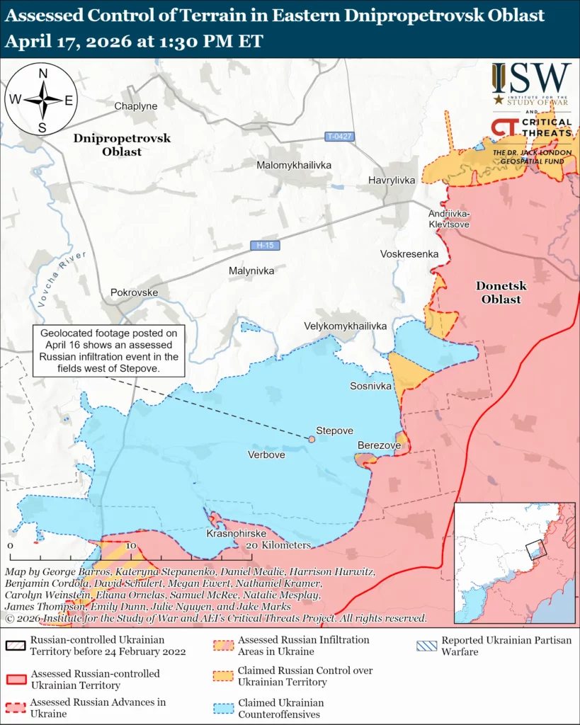Russian forces recently conducted infiltration missions in the Oleksandrivka direction, as Ukrainian forces continued limited counterattacks.[39] Geolocated footage published on April 16 shows Ukrainian forces striking Russian positions west of Stepove (southeast of Oleksandrivka) conducting what ISW assesses was likely a Russian infiltration mission.[40]