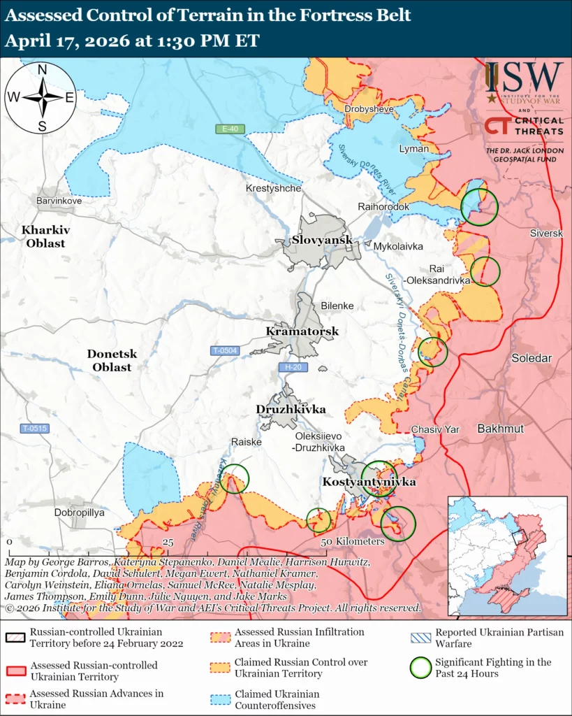 Russian forces recently conducted infiltration missions in the Kostyantynivka-Druzhkivka tactical area. Geolocated footage posted April 16 shows Ukrainian forces striking Russian positions in eastern Kostyantynivka and northeast of Berestok (southwest of Kostyantynivka) after what ISW assesses were Russian infiltration missions.[31] The spokesperson for a Ukrainian brigade operating in the Kramatorsk direction reported that Russian forces are also trying to infiltrate Maiske (northeast of Kostyantynivka) and are using many motorcycles to conduct infiltration missions.[32]