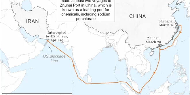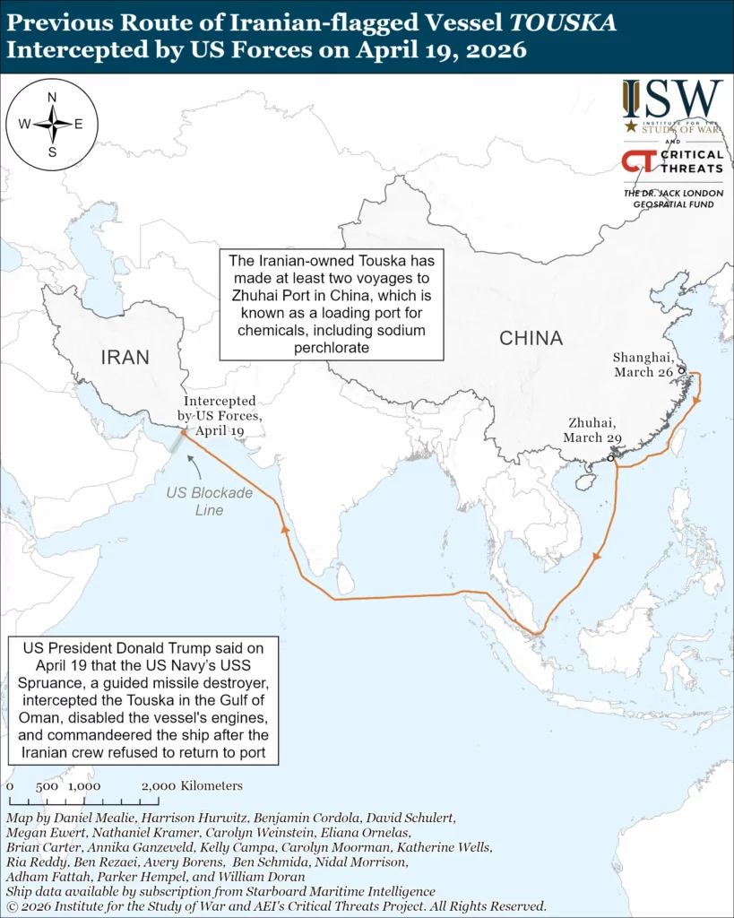 The Khatam ol Anbia Central Headquarters claimed that the April 19 seizure of the Iranian-flagged, US-sanctioned Touska by the US Navy violated the US-Iran ceasefire.[17] The spokesperson for the Khatam ol Anbia Central Headquarters, which is functionally controlled by the IRGC, warned on April 19 that Iranian forces will respond to the US seizure of the Touska and asserted that the United States had “violated the ceasefire.”[18] Unspecified security sources told Reuters that the Touska was likely transporting dual-use items from China to Iran.[19] The sources added that the Touska had previously transported dual-use items to Iran.[20] US Central Command (CENTCOM) told United Kingdom Maritime Trade Operations (UKMTO) on April 16 that it considers raw materials such as oil, iron, steel, aluminum, and certain civilian goods with both civilian and military applications to be “conditional contraband.”[21] CENTCOM also defined electronic components, computer systems, machinery, and power generation equipment as “conditional contraband.”[22] The Touska visited the port of Zhuhai in China in March.[23] Zhuhai Port is considered a loading port for chemicals, including missile fuel precursor sodium perchlorate, according to the Washington Post.[24] The Wall Street Journal reported that a subsidiary of the US-sanctioned Islamic Republic of Iran Shipping Lines (IRISL), Rahbaran Omid Darya Ship Management, owns the Touska.[25] Two vessels owned by Rahbaran Omid Darya Ship Management transported approximately 1,000 tons of material used in missile propellant in 2025, according to the Wall Street Journal.[26]
