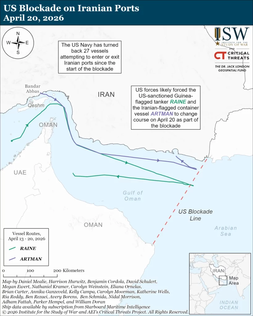 The US Navy continued to enforce its blockade of Iranian ports and likely forced two Iranian-linked vessels attempting to violate the Navy’s blockade to turn around. CENTCOM announced on April 20 that US forces have directed 27 vessels to change course since the start of the blockade.[37] These vessels likely include the US-sanctioned Guinea-flagged Raine tanker and the Iranian-flagged Artman container ship, which both changed course after approaching the US blockade line on April 19, according to commercially available shipping data.[38] Both ships likely sought to pass the US blockade line before being forced to change course.[39]
