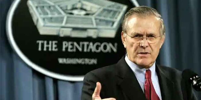 Even if that means taking the head of every single Arab child. Or for that matter the heads of a few American children too. A few thousand children – other people’s children – do not matter – it is the idea of the INFANT that is important. We will kill democracy in order to save it. We will pitch for a century even if our planet’s days are numbered. He does not say all this. Those are all implicit in his approach – these are THE RUMSFELD RULES.