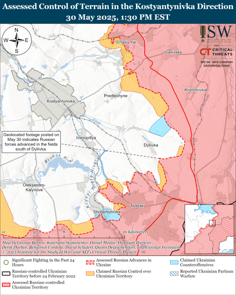 Russian forces attacked northeast of Pokrovsk near Malynivka and Myrolyubivka and toward Koptieve; east of Pokrovsk near Yelyzavetivka; southeast of Pokrovsk near Lysivka; and southwest of Pokrovsk near Kotlyne and Udachne on May 29 and 30.[53] A Russian milblogger claimed on May 29 that Ukrainian forces counterattacked near Yelyzavetivka.[54]