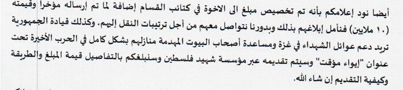 We want to inform you that an amount has been allocated to the brothers in the al-Qassam Brigades in addition to what was recently sent, with a value of (10 million). We hope to inform them of this, and we are in contact with them to arrange transportation. The leadership of the [Iranian Islamic] Republic also wants to support the families of the shaheeds in Gaza and assist homeowners whose houses were completely destroyed in the last war, support called “temporary shelter.” It will be provided through the Palestine Shaheeds’ Fund, and we will further inform you regarding the amount, the method and how it will be implemented.