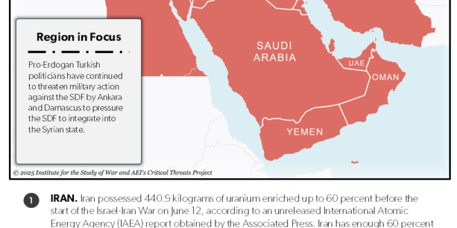 Iran’s Enriched Uranium: Iran possessed 440.9 kilograms of uranium enriched up to 60 percent before the start of the Israel-Iran War on June 12, according to an unreleased International Atomic Energy Agency (IAEA) report obtained by the Associated Press. Iran has enough 60 percent enriched uranium, if enriched further, to produce at least 10 nuclear weapons. Iran is unlikely able to access this uranium due to the damage that Israeli and US strikes caused to Iranian nuclear facilities during the war, however.