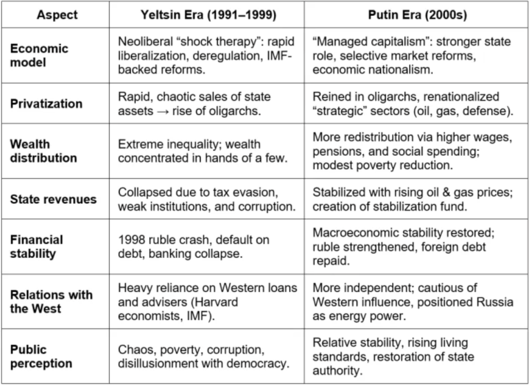 Poutine a annulé bon nombre de ces réformes néolibérales, réaffirmant le contrôle de l’État sur les industries stratégiques et limitant l’influence politique oligarchique. Ce virage vers la souveraineté économique le place en opposition avec l’ordre néolibéral.