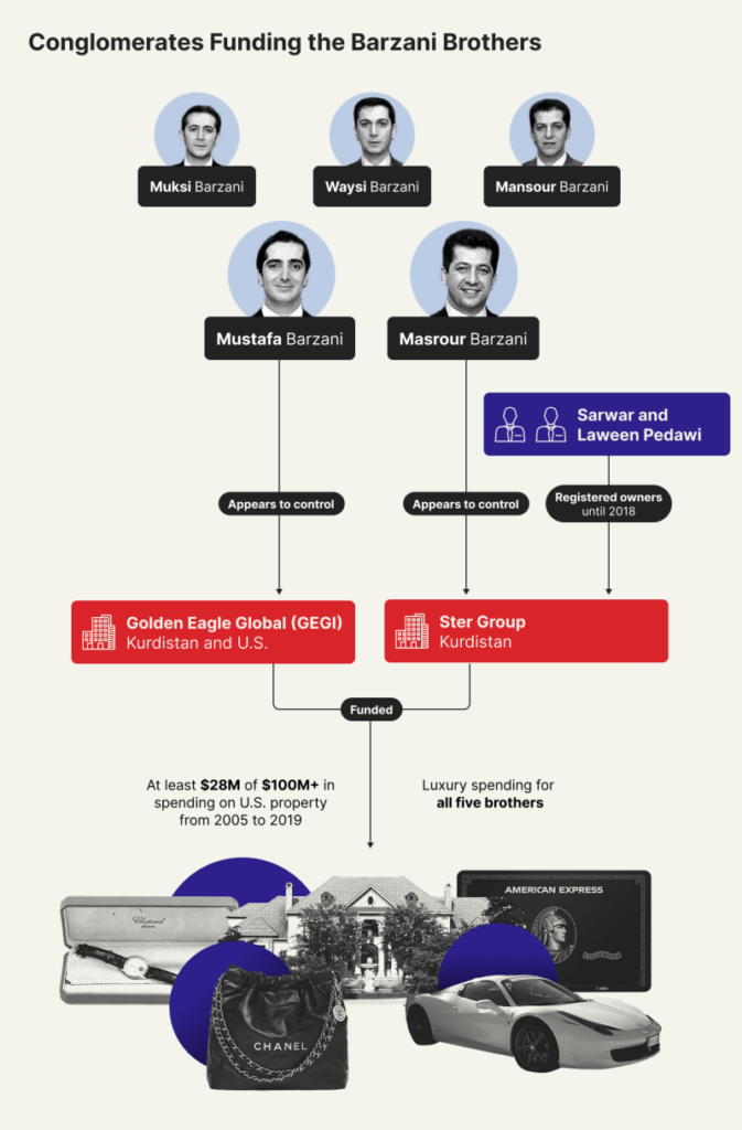 - More than $10 million used for these purchases originated from Golden Eagle Global, an Iraqi Kurdish conglomerate that leaked documents suggest was controlled by Mustafa Barzani, the youngest of the brothers.