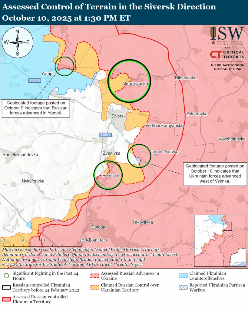 Refinement of areas under Russian claims: Geolocated footage published on October 10 indicates that Ukrainian forces maintain positions or recently advanced in northeastern Yampil (southeast of Lyman) — an area in which Russian sources previously claimed that Russian forces maintained a presence.[60]