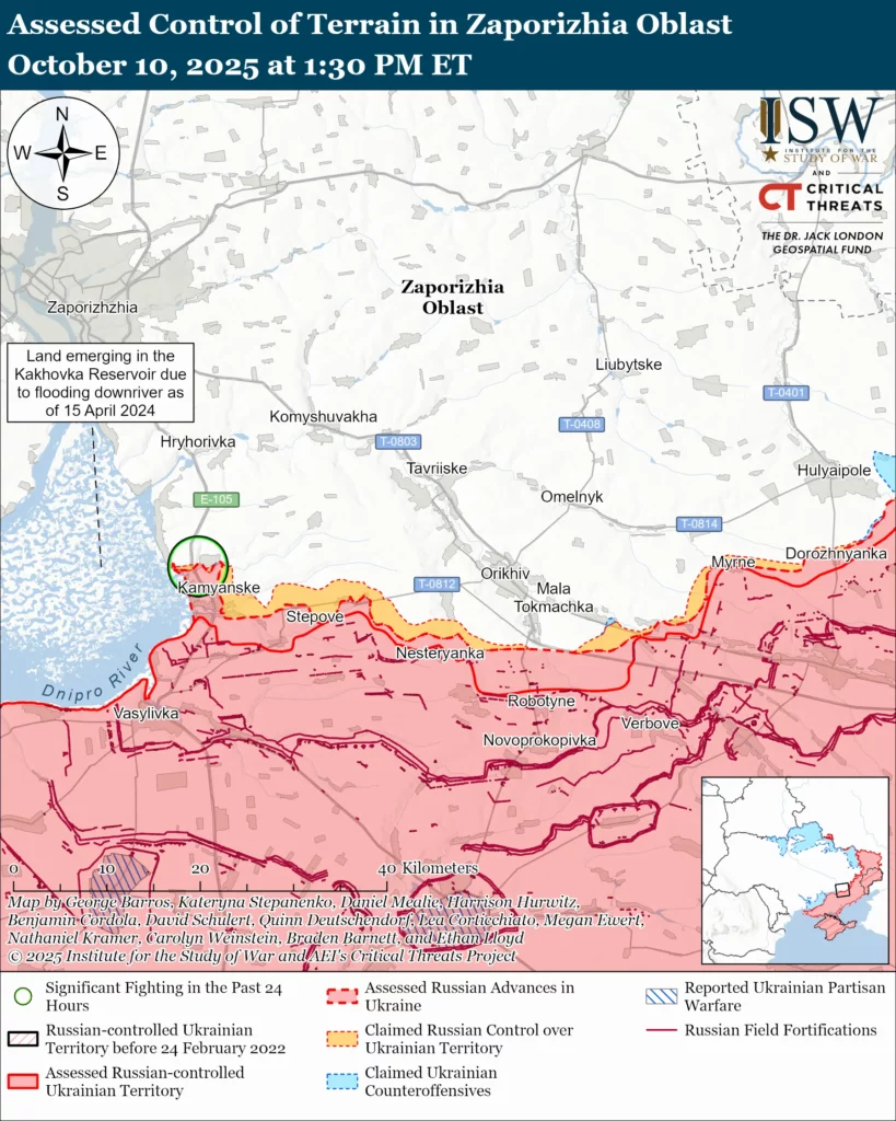 Ukrainian President Volodymyr Zelensky reported that Russian strikes injured over 20 civilians and killed a child in Zaporizhzhia City.[2] Zelensky stated that the Russian strikes caused power outages in Kyiv City and Oblast and Donetsk, Chernihiv, Cherkasy, Kharkiv, Sumy, Poltava, Odesa, and Dnipropetrovsk oblasts, and that Russian forces also targeted Zaporizhia, Kirovohrad, and Kherson oblasts. Ukrainian Foreign Minister Andriy Sybiha noted that October 10 is also the third anniversary of the first major Russian strike on Ukrainian energy infrastructure in 2022, underscoring Russia’s annual efforts to undermine Ukrainian morale by striking energy infrastructure during the fall and winter.[3] Poltava Oblast Military Administration Head Volodymyr Kohut reported that Russian strikes against energy infrastructure left 16,578 households in Poltava Oblast without electricity.[4] Kyiv City Military Administration Head Timur Tkachenko reported that the Russian strikes left 5,800 apartment buildings and homes without power and water in the city.[5] Russia has increasingly used recent strikes to target smaller regional Ukrainian energy facilities with more limited air defenses, likely in an effort to capitalize on Ukraine’s limited number of Patriot air defense systems.[6] ISW continues to assess that Russia is prioritizing strikes against civilian and energy infrastructure to continue its long-standing campaign to degrade Ukraine’s energy security ahead of winter 2025-2026 and demoralize the Ukrainian populace.[7] Russia’s ongoing and ever-intensifying long-range strike campaign against Ukraine is just one indicator of Russian President Vladimir Putin’s disinterest in peace.