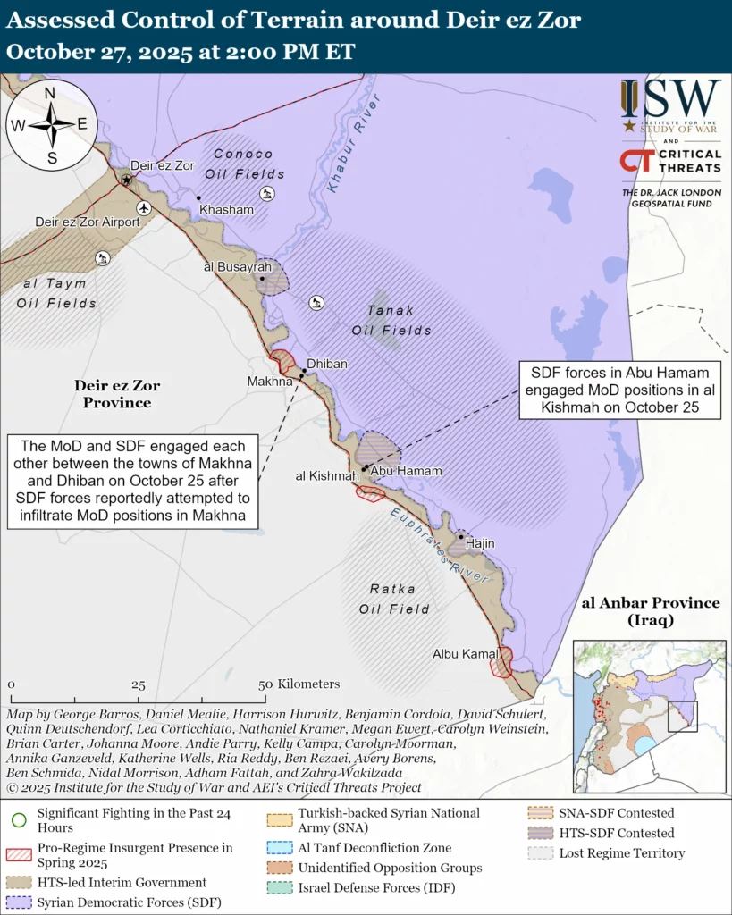 The Syrian Democratic Forces (SDF) and the Syrian Ministry of Defense (MoD) continue to conduct engagements of little tactical significance along their frontlines in Deir ez Zor Province. The MoD engaged SDF forces with small arms and mortars across the Euphrates River on October 25 between the towns of Makhna and Dhiban after SDF forces reportedly attempted to infiltrate MoD positions in Makhna.[42] The MoD reinforced its positions in Makhna after the engagement, and the SDF deployed a reconnaissance drone above the area in response, according to a local media outlet.[43] It is possible that the SDF infiltration attempt was related to local SDF smuggling efforts because there are persistent smuggling attempts across front lines on the Euphrates River. A local anti-SDF source has repeatedly implied that the SDF is involved in smuggling across the Euphrates River.[44] SDF forces in Abu Hamam separately engaged MoD positions across the Euphrates River in al Kishmah, Deir ez Zor Province, after the SDF received rocket-propelled grenade fire from MoD positions in al Kishmah on October 25.[45] The SDF issued a statement on October 25 that only acknowledged the engagement in Abu Hamam and said that the engagement caused no casualties.[46] This is the second SDF-MoD engagement in Deir ez Zor Province since the two parties signed a ceasefire agreement on October 7.[47] The SDF and MoD previously engaged each other in Deir ez Zor City on October 9.[48]