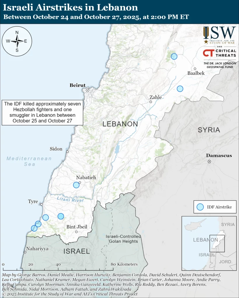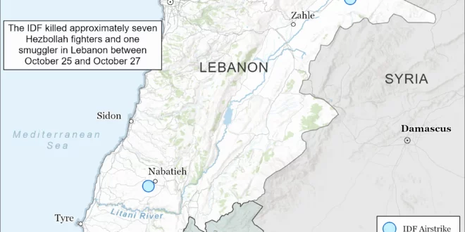 Israeli Strikes in Lebanon: The Israel Defense Forces (IDF) continued its airstrike campaign across Lebanon to prevent Hezbollah reconstitution efforts. The IDF has killed approximately seven Hezbollah fighters and one Hezbollah-affiliated weapons smuggler since CTP-ISW’s last data cutoff on October 24.