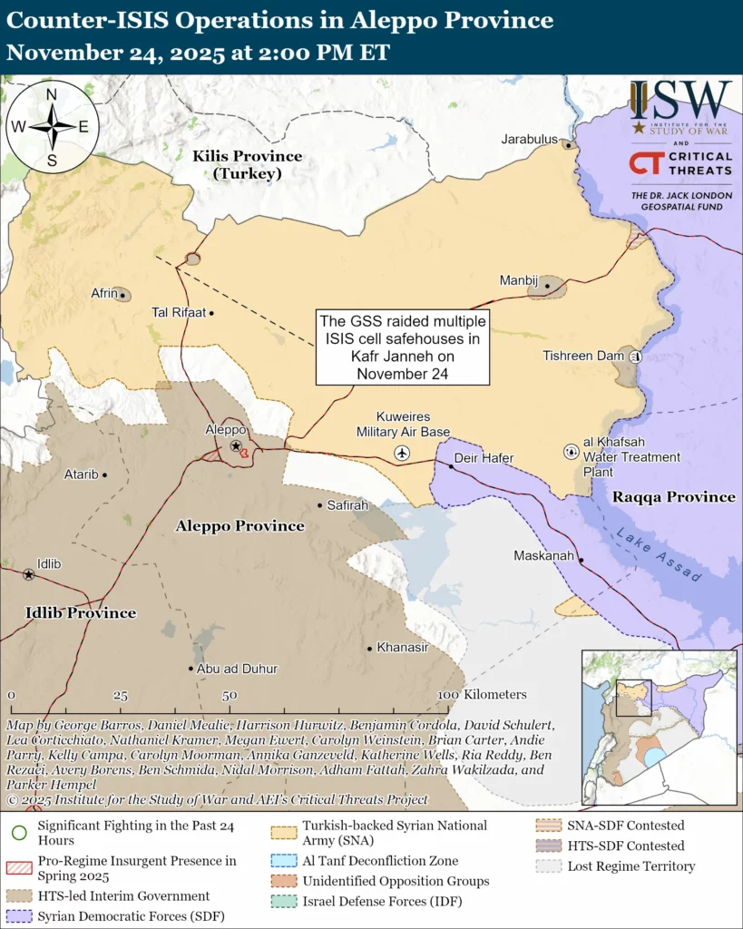 The GSS conducted a raid targeting Islamic State in Iraq and al Sham (ISIS) cells in northwest Aleppo Province in the GSS’s first counter-ISIS operation since Syria joined the Global Coalition Against ISIS.[60] Syrian media reported that the GSS raided multiple ISIS cell safehouses in Kafr Janneh, Aleppo Province, on November 24.[61] An unspecified MoI source told Syrian state media that the GSS targeted ISIS cells in Kafr Janneh that threatened the security and stability of Aleppo Province.[62] The GSS has not reported the number of ISIS fighters that it arrested or reported whether the GSS sustained casualties during the operation at the time of this writing. This operation is the first counter-ISIS operation that the GSS has conducted since Syria joined the Global Coalition Against ISIS on November 10.[63] US Central Command (CENTCOM) and the Syrian MoD previously conducted a joint raid on an ISIS safehouse in al Bab, northern Aleppo Province, on July 25 that killed senior ISIS leader, Dhiya Zawba Muslih al Hardani, and his two ISIS-affiliated sons.[64]