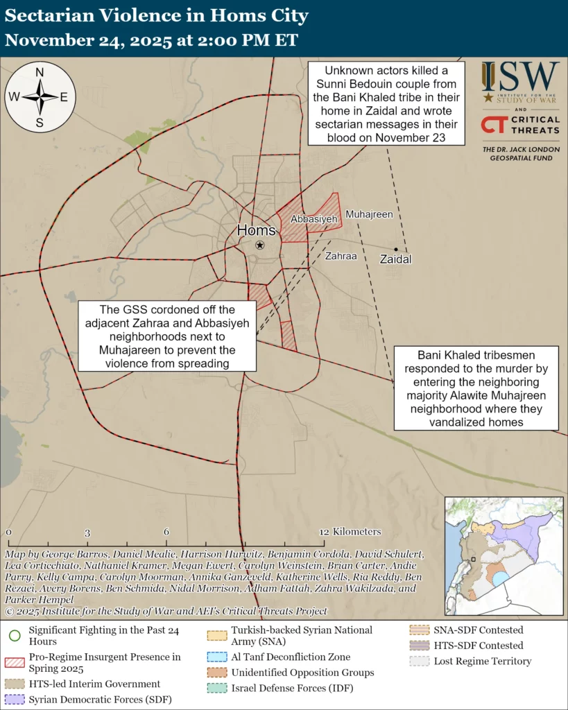 Unknown actors attempted to instigate sectarian conflict between Sunnis and Alawites in Homs City, but the responses of local security forces and residents contained the violence and prevented its spread or intensification. Unknown actors killed a Sunni Bedouin couple from the Bani Khaled tribe in their home in Zaidal, in the western outskirts of Homs City, on November 23.[46] A Syrian source reported that unknown actors wrote sectarian slogans in the victim’s blood on the walls of the house in an attempt to incite widespread sectarian conflict in Homs City.[47] One of the slogans was “Ya Hussein,” a Shia phrase that Alawites use.[48] Zaidal neighbors several of Homs City’s Alawite-majority neighborhoods. Members of the Bani Khaled tribe vandalized homes in the neighboring majority Alawite Muhajreen neighborhood in response to the murder, according to an independent Syria researcher in Homs City.[49] The General Security Service (GSS) cordoned off Muhajareen‘s adjacent neighborhoods of Zahraa and Abbasiyeh to prevent the violence from spreading.[50] Bani Khaled tribesmen later broke through the GSS cordon and attacked Alawite and Sunni homes in the mixed Bedouin-Alawite neighborhood of Abbasiyeh.[51] The independent researcher emphasized that the GSS tried to contain the situation and restore order in western Homs, but struggled due to insufficient resources to cordon off hundreds of streets.[52] The GSS reestablished control of Abbasiyeh after the Syrian Ministry of Defense (MoD) deployed fighters to the area and erected other barriers to prevent the violence from spreading.[53] Unaffiliated Bedouin tribesmen also helped the GSS restrain Bani Khaled tribesmen in Abbasiyeh, which shows that the tensions were not strictly Sunni–Alawite.[54] The GSS imposed a temporary curfew over Homs City.[55] The combined efforts by the GSS and local Bedouins were critical in preventing the spread of sectarian violence in the area, such as how the deployment of Syrian forces exacerbated violence along the Syrian coast on March 6.[56] The GSS isolated the sectarian unrest in Homs through containment measures, cross-communal cooperation, and rapid intervention, which reduced the violence and prevented it from escalating into mutual sectarian reprisals. The Homs Health Directorate reported that 18 people were injured in Homs City on November 23 but did not report any deaths.[57]