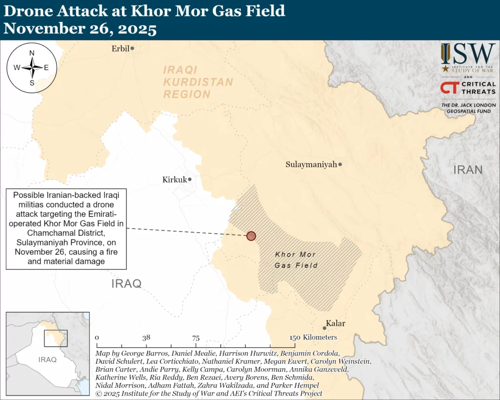 Drone Attack in Iraqi Kurdistan: Iranian-backed Iraqi militias may have conducted a drone strike targeting the Emirati-operated Khor Mor Gas Field in Chamchamal District, Sulaymaniyah Province, Iraq, on November 26 to try to deter Iraqi Kurdish political parties from working against Iranian-backed Iraqi parties in the government formation process. The drone attack caused material damage and sparked a fire but did not cause any casualties.