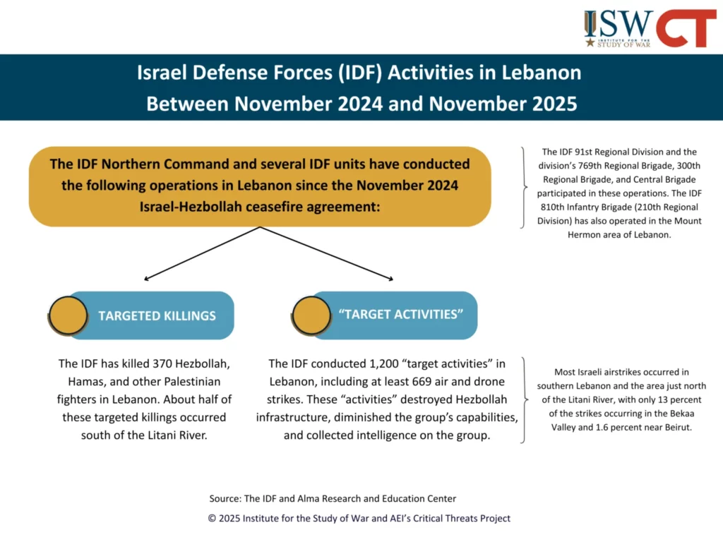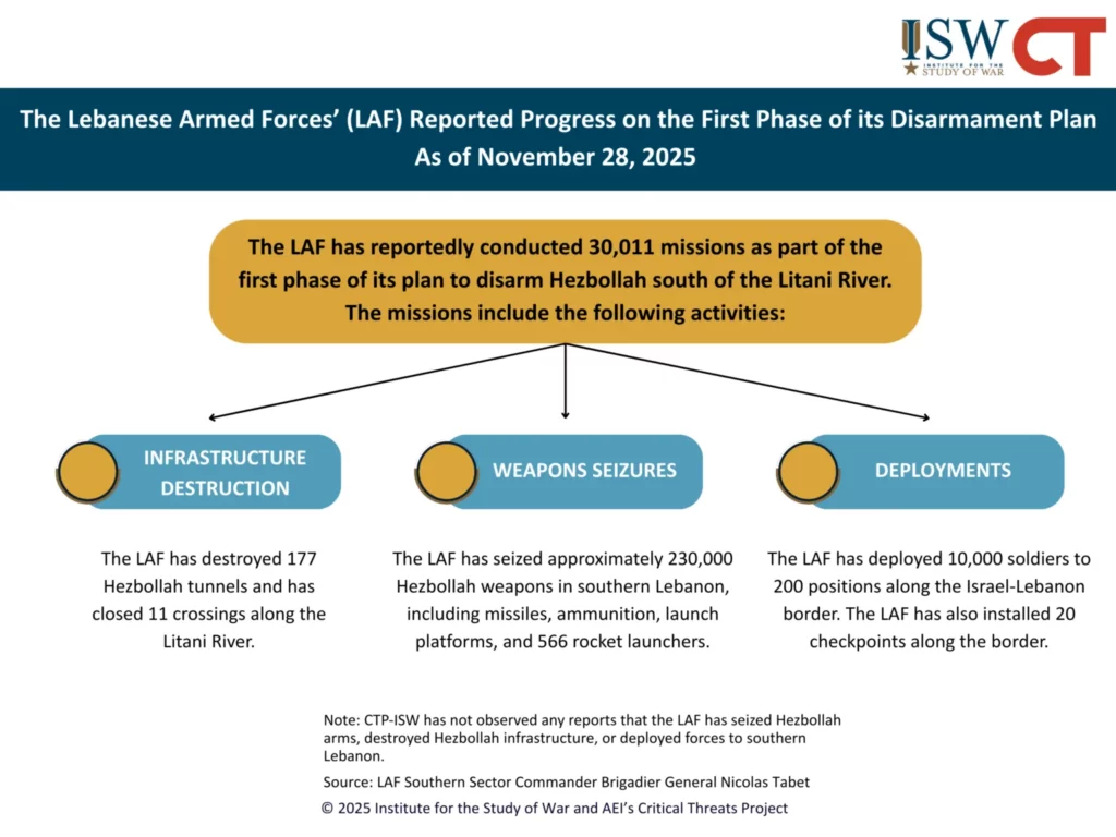 Israel reportedly gave the Lebanese Armed Forces (LAF) a deadline of December 7 to make progress in its disarmament of Hezbollah amid ongoing Israeli preparations for a potential operation in Lebanon.[1] An Israeli Channel 13 journalist reported on November 28 that the LAF has until after Pope Leo XIV and US Deputy Special Envoy Morgan Ortagus’s upcoming visits to Beirut to show unspecified progress on its disarmament plan.[2] Pope Leo XIV will visit Beirut between November 30 and December 2, and Ortagus will visit Beirut on December 5 and 6.[3] Israel has simultaneously continued to prepare for a potential operation in Lebanon. Israeli Prime Minister Benjamin Netanyahu held a “special discussion” with Israeli defense officials on November 27, during which the defense officials presented operational plans to continue “enforcement activities” and prevent Hezbollah reconstitution.[4] Israel’s reported deadline comes amid Israeli officials’ frustration with the LAF’s lack of progress on its plan to disarm Hezbollah and repeated warnings about a potential Israeli operation in Lebanon.[5] Israeli officials told Israeli media on November 27 that Israel is “running out of patience” over the LAF’s continued delays and reiterated how Hezbollah is working to reconstitute its military capabilities and infrastructure.[6] The officials warned that Hezbollah’s reconstitution activities may lead to increased Israeli operations along Israel’s northern border.[7] Israel has consistently conducted air and drone strikes in Lebanon as well as targeted killings to prevent Hezbollah reconstitution since the November 2024 Israel-Lebanon ceasefire agreement.[8] US officials have also expressed frustration over the LAF’s lack of progress.[9] US President Donald Trump recently warned the Lebanese government that Israel will launch an operation if the LAF does not disarm Hezbollah by the end of 2025, according to the Israeli Channel 13 journalist.[10]