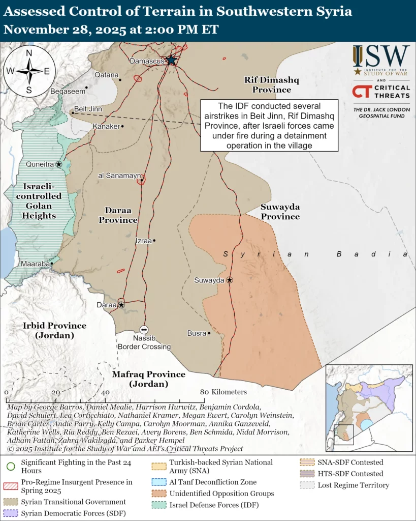 The Israel Defense Forces (IDF) conducted several airstrikes in Beit Jinn, Rif Dimashq Province, on November 28.[47] The 55th Reserve Paratroopers Brigade (210th Division) initially entered Beit Jinn to detain three villagers that the IDF said were al Jamaa al Islamiyya members planning to attack Israeli citizens.[48] Al Jamaa al Islamiyya is a Lebanese Muslim Brotherhood splinter, and its fighters have previously engaged Israeli forces in southern Lebanon.[49] An al Jamaa al Islamiyya representative to the Lebanese Parliament denied that the organization has members in southern Syria.[50] Israeli forces came under fire during the detainment operation.[51] Israeli forces engaged locals in Beit Jinn on November 28, killing 13 villagers and injuring 20 others, according to Syrian media.[52] The engagement injured six Israeli soldiers.[53] Syrian Foreign Minister Asaad al Shaibani condemned the “persistence” of Israeli operations in Syria and said that such operations “threaten regional peace and security.”[54] Israel’s public broadcaster reported that Israeli Defense Minister Israel Katz told the Israeli Foreign Affairs and Defense Committee on November 26 that Israel is “not on track” for peace with Syria.[55] Katz also told the committee that there are several armed groups, including the Houthis, operating in southern Syria that are considering a ground operation into the Israeli-controlled Golan Heights.[56] Katz’s statements highlight Israel’s heightened threat perception of southern Syria.