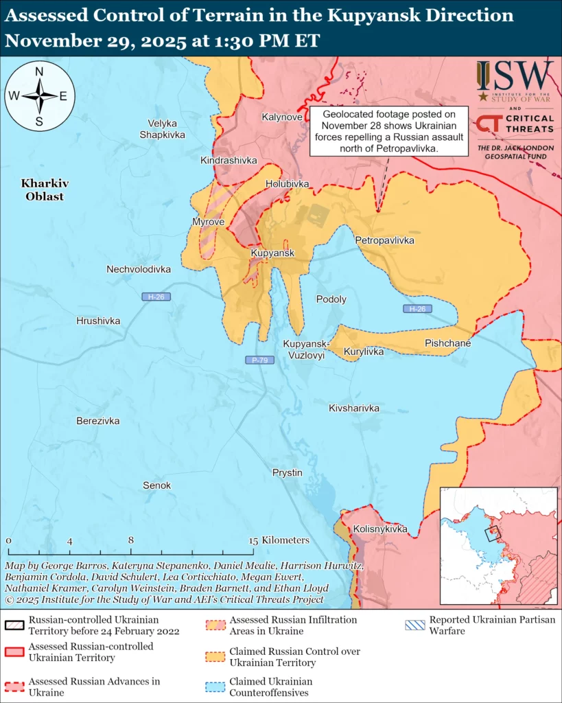 Russian forces attacked near Kupyansk itself; east of Kupyansk near Petropavlivka; and southeast of Kupyansk near Pishchane and Hlushkivka on November 28 and 29.[52]