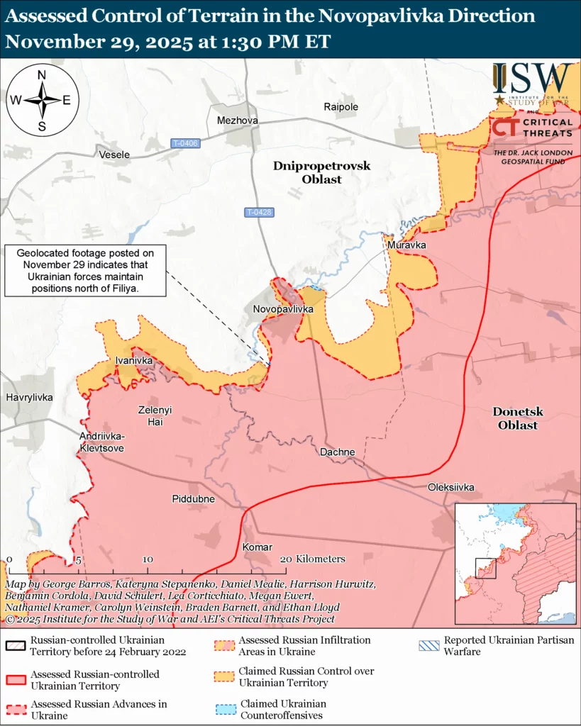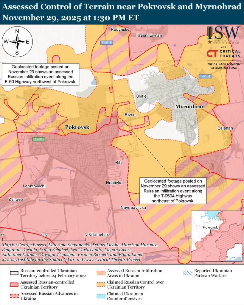Assessed Russian infiltrations: Geolocated footage published on November 29 shows Ukrainian forces striking Russian forces northwest of Pokrovsk along the E-50 Pokrovsk-Pavlohrad highway and between Pokrovsk and Rivne (east of Pokrovsk) during what ISW assesses to have been Russian infiltration missions.[76] ISW assesses that these events did not change the control of terrain or the forward edge of the battle area (FEBA) at this time.