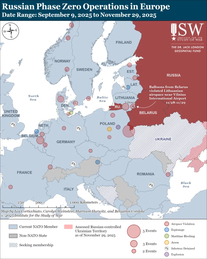 Balloons from Belarusian airspace continued incursions into NATO airspace in Lithuania overnight on November 28 to 29. Lithuanian authorities reported on November 29 that they detected over 60 balloons flying into Lithuanian airspace from Belarus overnight and that an unspecified number of balloons forced the Vilnius International Airport to temporarily suspend operations in the early morning of November 29, impacting 22 flights and 3,000 travelers.[30] Aerial incursions have forced Vilnius International Airport to suspend operations several times in recent months.[31] ISW continues to assess that Russia is increasingly engaging in covert and overt attacks against Europe and the ongoing Russian airspace violations are likely part of “Phase Zero” — Russia’s broader informational and psychological condition-setting phase — to prepare for a possible NATO-Russia war in the future.[32] ISW continues to assess that Belarus is Russia’s de facto cobelligerent in the war in Ukraine, thus, Belarusian incursions into NATO airspace are very likely part of Russia’s broader Phase Zero effort.[33]