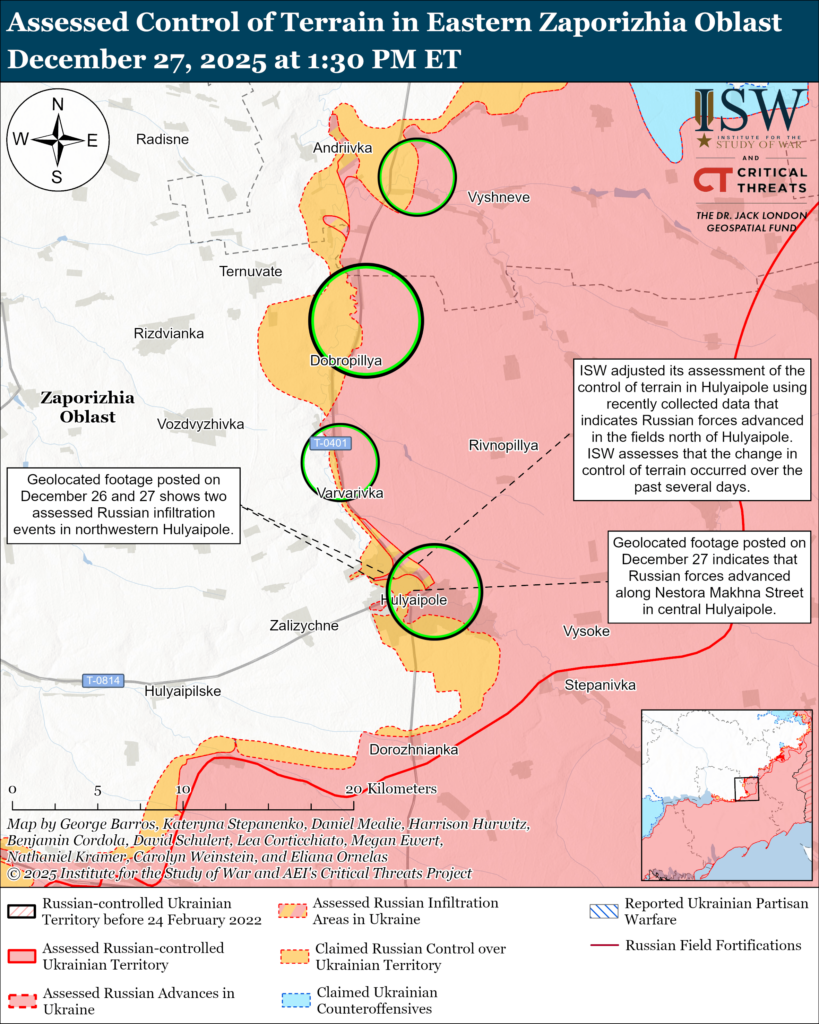 Assessed Russian infiltrations: Geolocated footage published on December 26 shows Ukrainian forces striking a Russian-occupied building in northwestern Hulyaipole and Russian forces raising flags in western Hulyaipole after what ISW assesses were Russian infiltrations missions that did not change control of terrain or the FEBA at this time.[83]