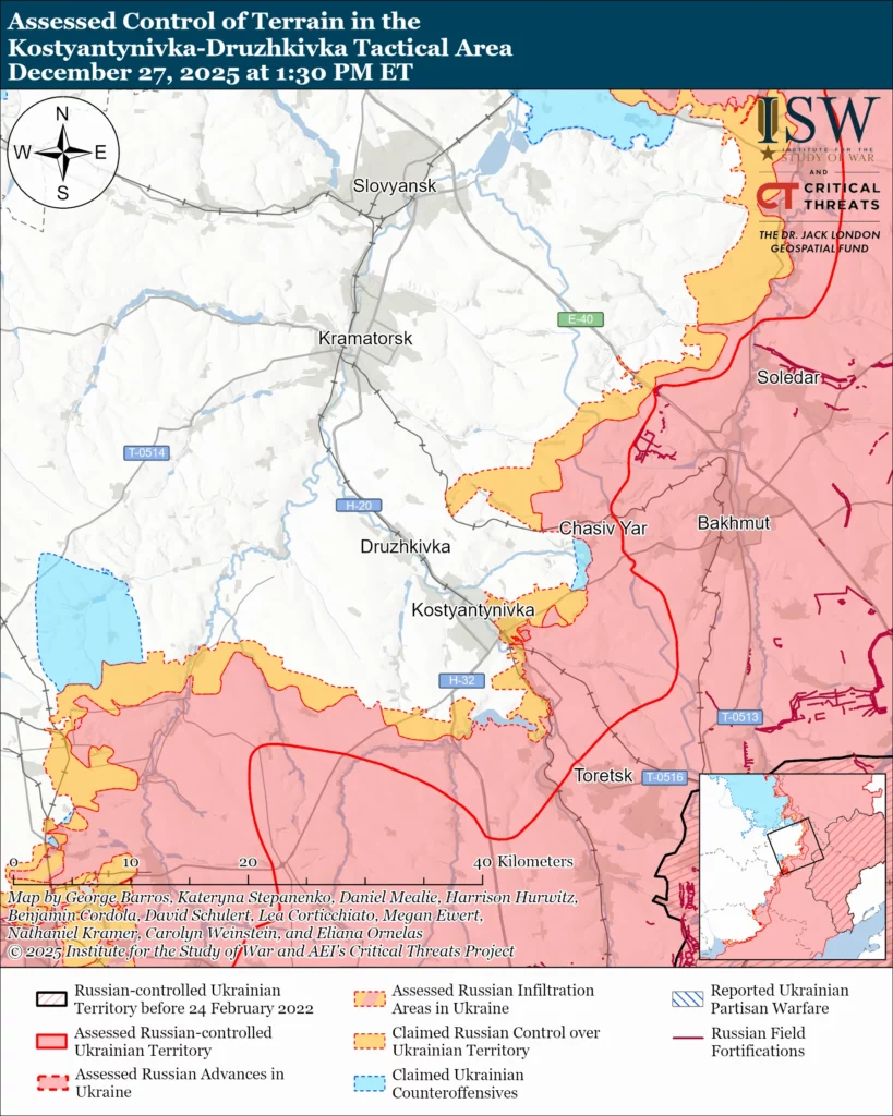 Russian forces continued offensive operations in the Kostyantynivka-Druzhkivka tactical area on December 27 but did not advance.