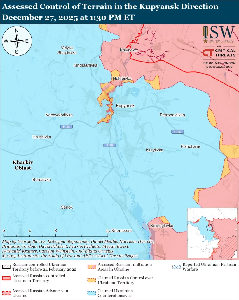 There is ample evidence to indicate that Ukrainian forces have liberated most of Kupyansk, however. Geolocated footage published on December 16, 20, and 26 indicates that Ukrainian forces recently advanced along the P-07 Kupyansk-Shevchenkove highway and the P-79 Kupyansk-Chuhuiv highway in central Kupyansk.[27] ISW has observed ample geolocated footage in recent weeks indicating Ukrainian advances near and within Kupyansk — in line with statements from Ukrainian officials about Ukrainian successes in the area.[28] Russian milbloggers, including some who have traditionally been hesitant to criticize the Russian MoD, have engaged in an unusual discourse acknowledging Ukraine’s successes and aggressively blaming the MoD for lying about Russian advances.[29] Select Russian milbloggers have tried to downplay or write off Ukrainian successes in the Kupyansk direction, which other milbloggers stated was “manipulative” and diverting attention away from the main problem at hand — the systemic culture of lying in the Russian military.[30] The Russian MoD is likely now doubling down on its efforts to cover up its failures in Kupyansk in order to not weaken Russia’s position in the ongoing peace talks with the United States. The scale of available open-source evidence of Ukrainian advances in the Kupyansk direction, coupled with the uncharacteristically high number of corroborating reports from Russian sources who do not typically discuss Ukrainian battlefield successes, seriously undermine the Kremlin’s cognitive warfare effort that aims to paint a Russian military victory as inevitable and Ukrainian defenses on the verge of collapse.