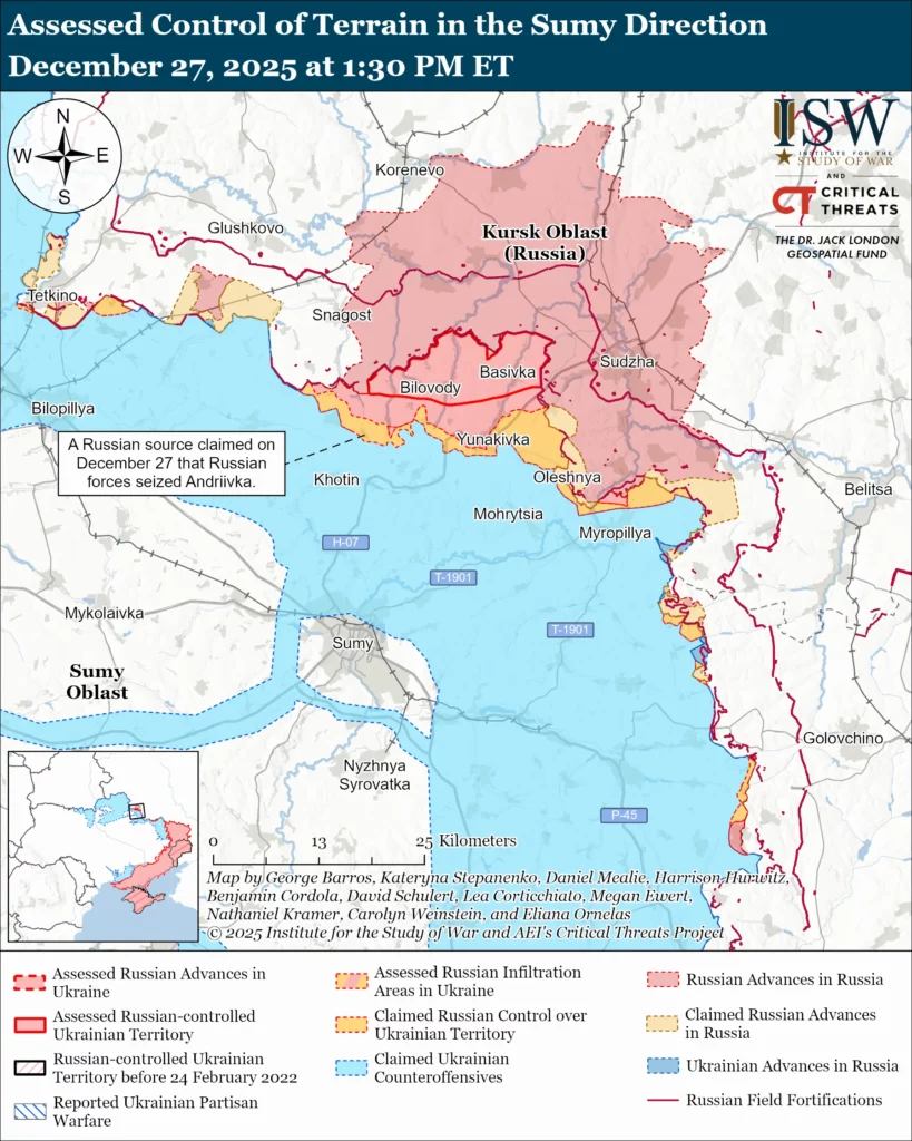 Russian forces continued offensive operations in northern Sumy Oblast on December 27 but did not make confirmed advances.