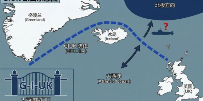 Cette suite de lettres représente une ligne de défense formée par le Groenland, l’Islande et le Royaume-Uni. Si l’on considère l’océan Atlantique comme une immense cour, la ligne GIUK en est la porte. L’accès à la mer pour l’Europe du Nord étant bloqué par l’étroite Manche, les sous-marins nucléaires véritablement menaçants, qui chercheraient à émerger de la calotte glaciaire arctique et à s’infiltrer furtivement dans les profondeurs de l’Atlantique pour menacer la côte est des États-Unis, ne peuvent passer que par le Groenland.