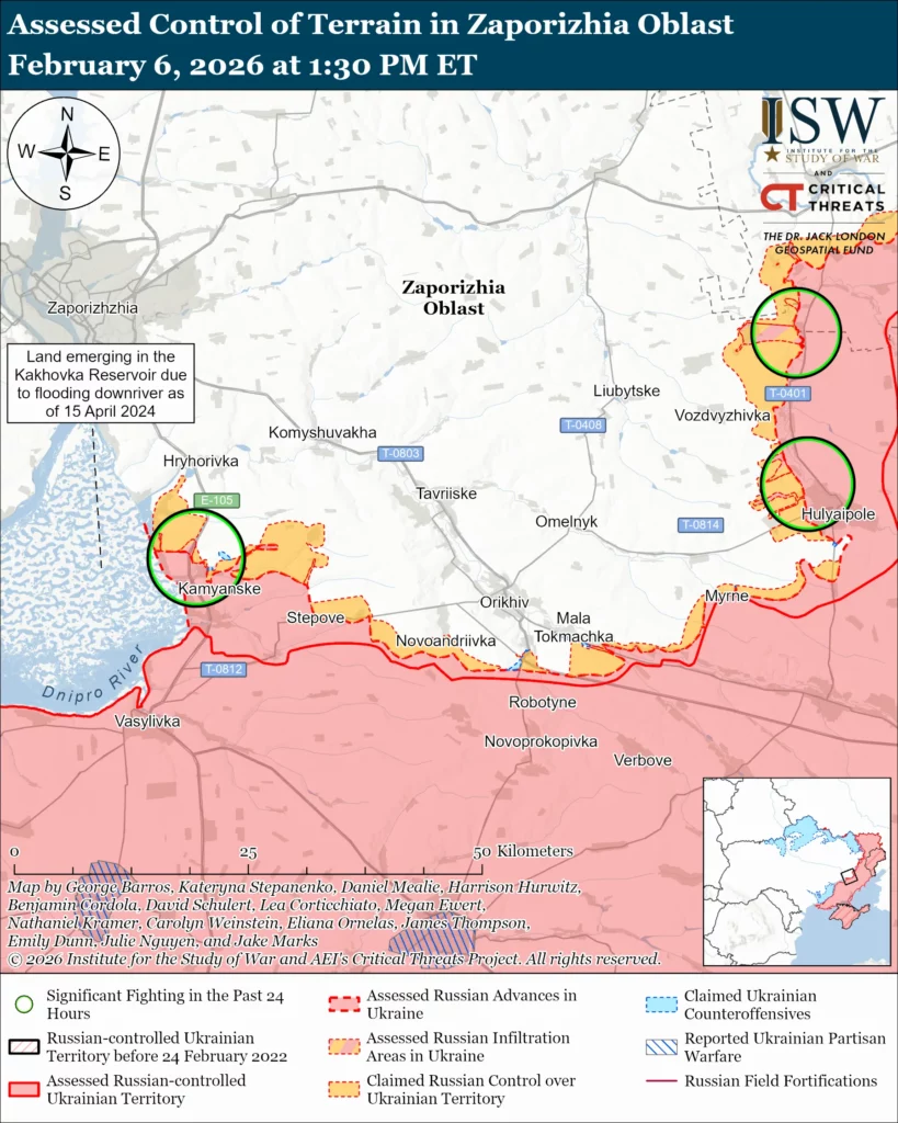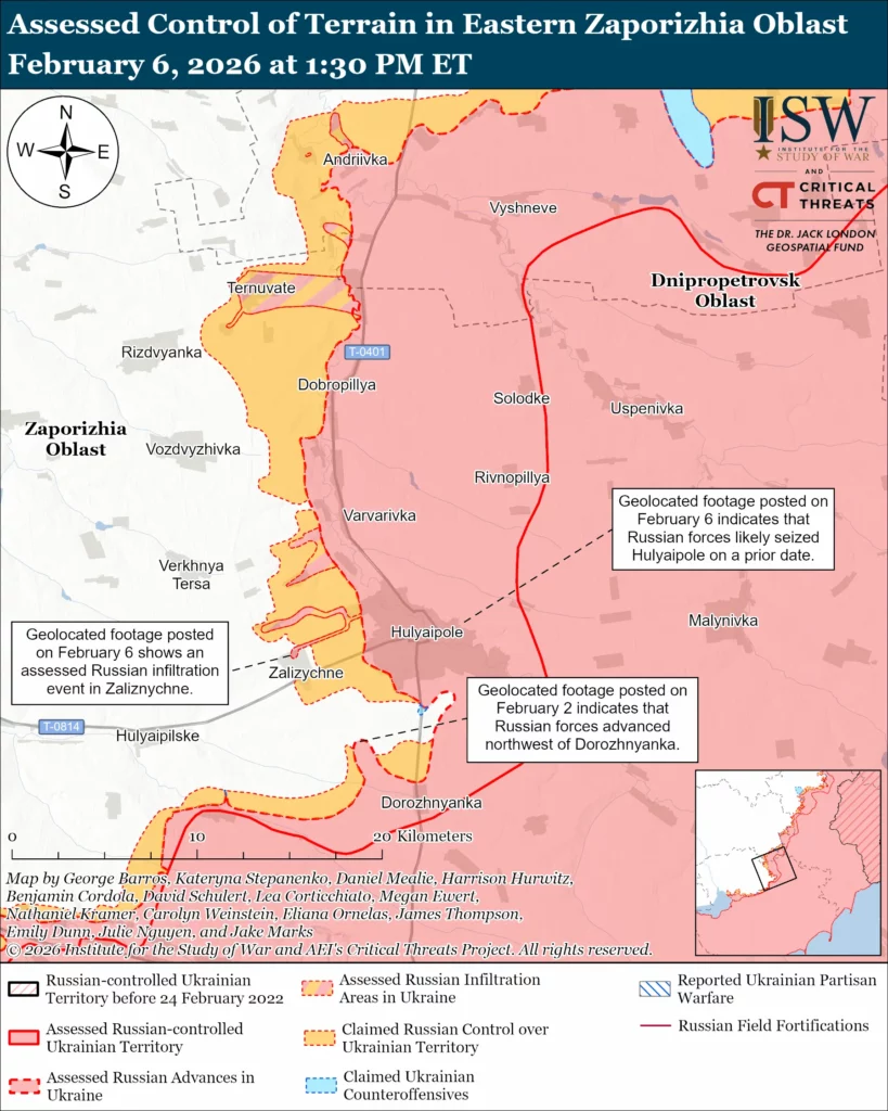 Assessed Russian infiltrations: Geolocated footage published on February 6 shows Ukrainian forces striking a Russian position in Zaliznychne (west of Hulyaipole) after what ISW assesses was infiltration operation that did not change the control of terrain or the forward edge of battle (FEBA).[82]