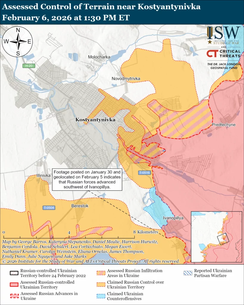 Assessed Russian advances: Geolocated footage published on February 2 and 5 indicates that Russian forces likely seized Novomarkove (northeast of Kostyantynivka).[60] Additional geolocated footage published on January 30 and February 5 indicates that Russian forces advanced into northern Pryvillya (northeast of Kostyantynivka) and southwest of Ivanopillya (south of Kostyantynivka).[61]