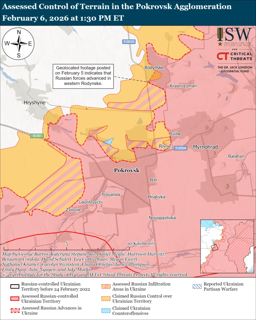 Russian forces attacked near and within Pokrovsk itself; northwest of Pokrovsk near Hryshyne and toward Novooleksandrivka; north of Pokrovsk near Rodynske and toward Bilytske; northeast of Pokrovsk near Zatyshok; east of Pokrovsk near Myrnohrad; southwest of Pokrovsk near Kotlyne, Udachne, Molodetske, and Novopidhorodne; and west of Pokrovsk toward Serhiivka on February 5 and 6.[70]
