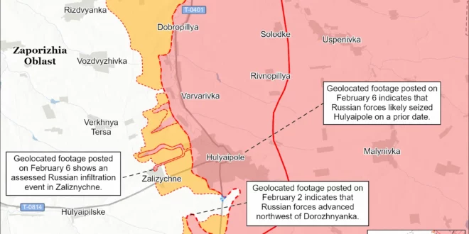 Russian forces likely seized Hulyaipole — a town with a pre-war population of roughly 13,000 – after three months of fighting and are unlikely to make rapid advances beyond Hulyaipole without deprioritizing other areas of the frontline. Geolocated footage published on February 6 shows Ukrainian forces striking Russian positions in northern Zaliznychne (west of Hulyaipole), indicating that Russian forces advanced beyond Hulyaipole at a prior date.[16] ISW has not observed evidence in the past few weeks that Ukrainian forces continue to maintain defensive positions in Hulyaipole, and the pattern of recent Russian infiltrations and advances in area suggests that Russian forces hold the town.[17] Russian forces began making relatively rapid advances in the Hulyaipole direction in early November 2025 after a months-long battlefield air interdiction (BAI) campaign that degraded Ukrainian logistics and ability to sustain frontline forces and defense against subsequent Russian ground operations.[18] Russian forces first infiltrated into Hulyaipole in mid-to-late November 2025, began consolidating positions in the town by mid-December 2025, and claimed to have seized Hulyaipole as of December 27.[19] These advances were contingent upon both the weather conditions in the area and the Russian prioritization of the effort. The relatively rapid Russian advances in the Hulyaipole direction exploited seasonal foggy and rainy weather conditions that hindered Ukrainian strike and reconnaissance drone operations, which allowed Russian forces to accumulate forces and advance under less threat.[20] These weather conditions did not last, however, as Russian forces entered the Hulyaipole built up area and winter conditions began degrading infantry operations since late December 2025.[21] The Russian military command had also committed elements of at least three combined arms armies (CAAs) to the areas east and northeast of Hulyaipole, while deprioritizing other sectors of the frontline.[22] Russian forces initially attempted to maintain simultaneous advances in the Hulyaipole and Oleksandrivka directions, but lacked the combat power to sustain both efforts, causing the Russian military command to deprioritize the Oleksandrivka direction.[23] Russian forces have consistently proven themselves unable to build large enough reserves to be able to flood a sector of the front without redeploying personnel from other areas.[24] Russian forces may seek to accelerate their advance in the Hulyaipole direction to support a potential Summer 2026 offensive toward Zaporizhzhia City from the south, but are likely unable or unwilling to redeploy forces and means from other frontline sectors to accomplish such an objective.