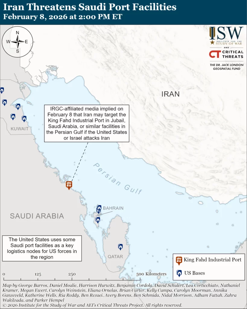 Islamic Revolutionary Guard Corps (IRGC)-affiliated Fars News reported on February 8 that Iran may target supply centers and ports in the region if the United States or Israel attacks Iran.[11] Fars News implied that Iran may specifically target the King Fahd Industrial Port in Jubail, Saudi Arabia, or similar facilities in the Persian Gulf.[12] The King Fahd Industrial Port in Jubail is one of the largest industrial ports in the Middle East, and it handles approximately 20 percent of Saudi trade throughput and approximately one-fifth of Saudi total transits.[13] The United States uses Saudi port facilities as a key logistics and prepositioning point for US forces in the region.[14] Fars News warned that an Iranian attack targeting a Persian Gulf port facilities such as the King Fahd Industrial Port, could cause the port to close, which would have significant economic impacts on oil exports and the global market.[15]