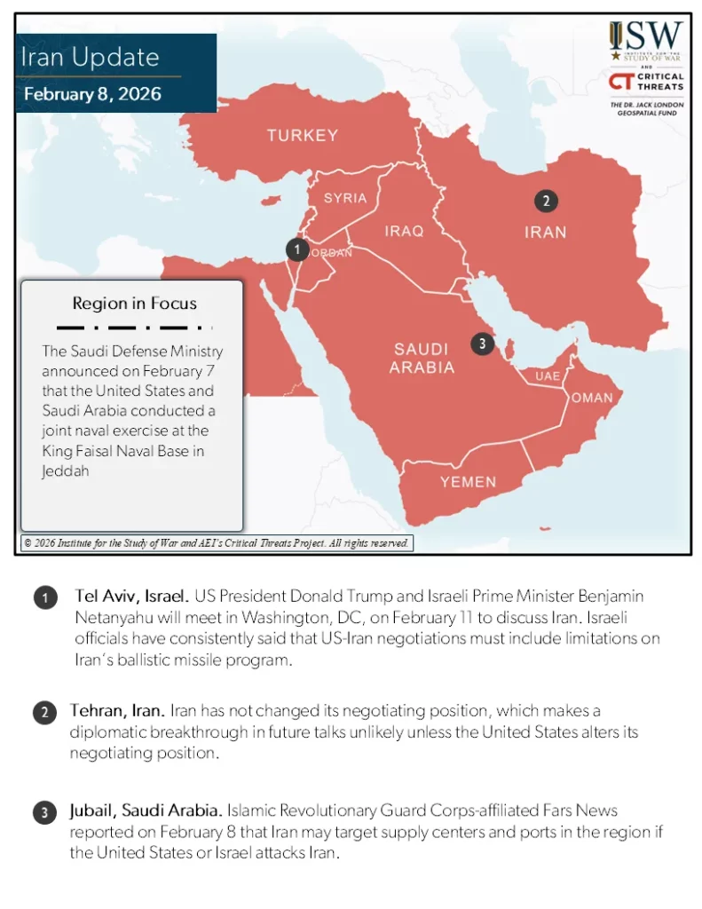 A Potential Iranian Retaliatory Attack: Islamic Revolutionary Guard Corps (IRGC)-affiliated Fars News reported on February 8 that Iran may target supply centers and ports in the region if the United States or Israel attacks Iran.