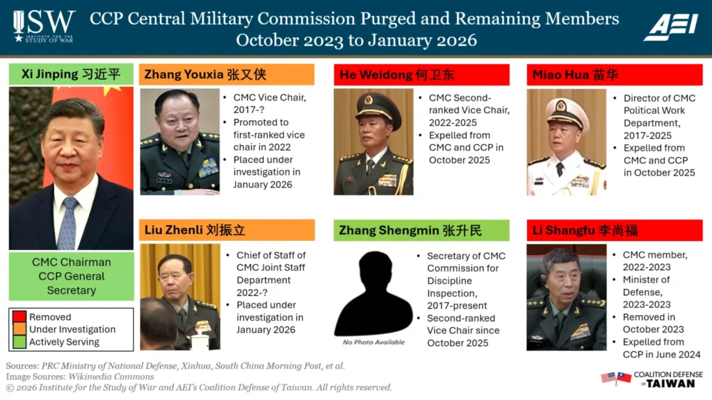 The remaining CMC member other than Xi—Zhang Shengmin—appears to be one of the few remaining senior military officers whom Xi still trusts. Zhang Shengmin has likely been involved in the investigations into the other CMC members given his role at the top discipline inspection official. Zhang Shengmin has been one of the most evident beneficiaries of previous purges, as he became a CMC vice chairman after the expulsion of He Weidong in October 2025 while retaining his discipline inspection role. Zhang Shengmin is not necessarily safe from the purges, however, especially as he has consolidated power on the CMC.