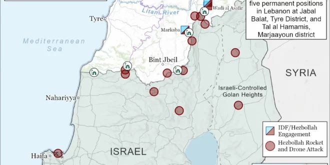 Hezbollah claimed that it conducted seven attacks targeting IDF positions and forces in northern Israel and southern Lebanon since CTP-ISW’s last data cutoff at 8:00 AM ET on March 6.[81] Hezbollah claimed that it launched a guided missile, rockets, and drones targeting IDF forces in Jabal Balat, Tyre District, and Markaba and Tal al Hamamis, both in Marjaayoun District, respectively.[82] Two of Israel’s five permanent positions in southern Lebanon that it has occupied since February 2025 are located at Tal al Hamamis and Jabal Balat.[83] Hezbollah also claimed that it launched rocket and drone attacks targeting three Israeli military sites and one town, all in northern Israel.[84] Hezbollah previously targeted all four locations during the October 7 War.[85]