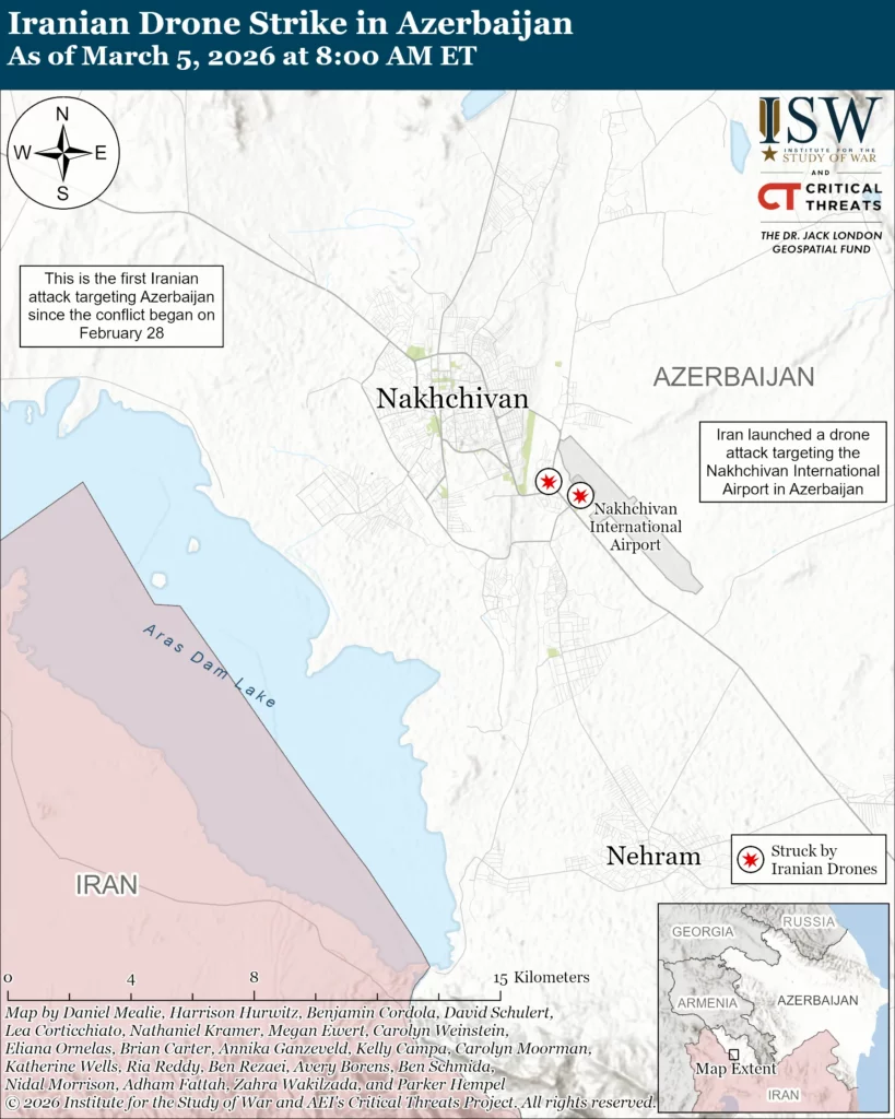 Iran launched attacks targeting Turkey and Azerbaijan on March 4 and 5. These attacks mark the 10th and 11th countries to come under Iranian fire.[13] Azerbaijan reported that an Iranian drone struck a terminal building at the Nakhchivan International Airport, which is located approximately six miles (10 kilometers) from the Azerbaijan-Iran border.[14] Azerbaijan reported that a second Iranian drone struck close to a school building in a nearby village.[15] The Azerbaijani Defense Ministry stated that these drone attacks will “not remain unanswered” and noted that Azerbaijan is preparing the “necessary” response measures.[16] The Iranian Armed Forces General Staff denied the attack.[17] The Turkish Defense Ministry reported on March 4 that NATO defense systems intercepted a ballistic missile that was launched from Iran towards Turkish airspace.[18] The ministry stated that Turkey will take ”all necessary steps to defend [its] territory.”[19] Iran has regularly targeted US forces, ports, oil and gas facilities, and civilian infrastructure in neighboring countries and the Gulf States since the conflict began on February 28.[20] An Iranian attack damaged a civilian high-rise apartment in Manama, Bahrain, for example.