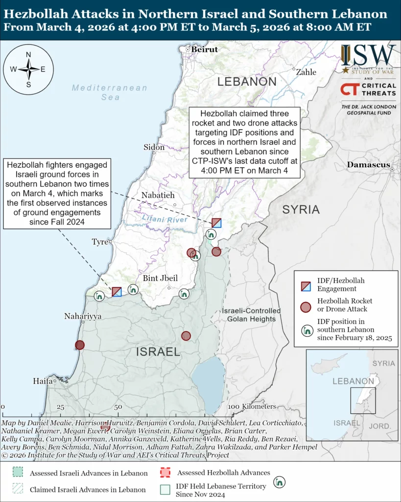 Hezbollah claimed that the group conducted 7 attacks targeting Israel Defense Forces (IDF) positions and forces in northern Israel and southern Lebanon since ISW-CTP’s last data cutoff at 4:00 PM ET on March 4. Hezbollah claimed on March 4 that its fighters engaged Israeli ground forces in Dhayra, Tyre District, and Khiam, Marjaayoun. These mark the first direct engagements between Hezbollah and the IDF since the fall 2024 Israel-Hezbollah conflict.