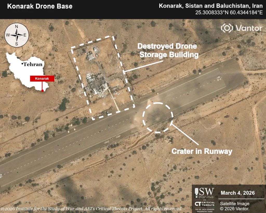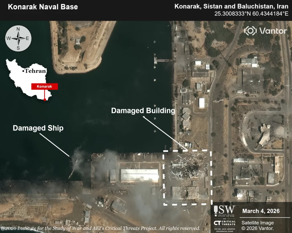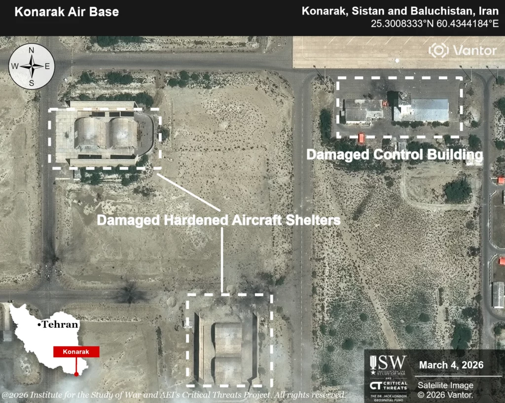 The combined force has continued to degrade Iran’s ballistic missile and drone capabilities to disrupt Iran’s ability to launch retaliatory attacks against Israel and US forces. Commercially available satellite imagery captured on March 4 shows that the combined force struck the Konarak drone base in Konarak, Sistan and Baluchistan Province, destroying a drone storage building and cratering the runway. The runway craters will temporarily prevent takeoffs. The combined force struck the drone base on March 1.[1] Commercially available satellite imagery captured on March 4 shows the combined force also struck the Konarak Airbase and damaged hardened aircraft shelters and a control building. The Konarak Airbase was reportedly transformed from a civilian airport into a military facility to launch drones.[2] Commercially available satellite imagery captured on March 4 also shows that the combined force destroyed an unspecified facility at the Khorramabad Missile Base in Khorramabad, Lorestan Province. The Khorramabad Missile Base reportedly contained multiple launchers and storage tunnels for ballistic and cruise missiles, specifically Shahab-3 medium-range ballistic missiles.[3] Israel previously struck the base in June 2025.[4] The decrease in retaliatory Iranian drone and missile attacks strongly suggests that the US-Israeli effort to destroy Iran’s ballistic missile and drone capabilities has had considerable success.[5]