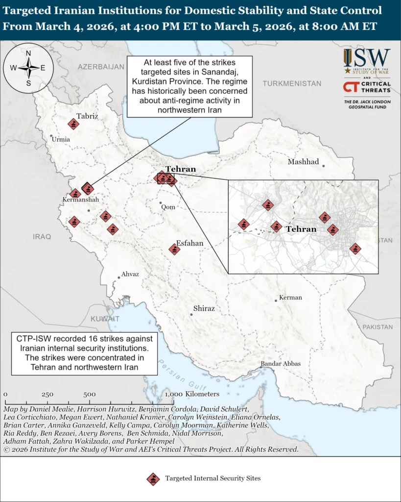 The combined force has continued to target Iran’s internal security and government institutions. The strikes were concentrated in Tehran and northwestern Iran. The regime has historically been concerned about anti-regime activity in northwestern Iran.