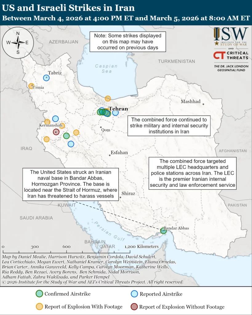 The combined force has continued to target Iran’s internal security and government institutions. The combined force struck three police stations and one Islamic Republic of Iran Broadcasting (IRIB) station in Sanandaj, Kurdistan Province.[6] Commercially available satellite imagery confirms that the combined force struck the Sanandaj Police Station No. 15. The combined force reportedly struck the Islamic Revolutionary Guard Corps (IRGC) Ground Forces’ 22nd Divisional Base in Sanandaj.[7] The regime used intense force to quell protests in Kurdistan Province during the 2022 Mahsa Amini protests.[8] The combined force also struck Law Enforcement Command (LEC) Headquarters across at least four provinces, including two in Lorestan Province.[9] An open source intelligence (OSINT) account reported without footage on March 5 that the combined force “leveled” the Lorestan Province LEC Headquarters.[10] The combined force also reportedly struck the IRGC Ground Forces’ 31st Ashoura Mechanized Division, which operates in Tabriz, East Azerbaijan Province.[11] The Ashoura Division fought in Syria to support the Assad regime.[12]
