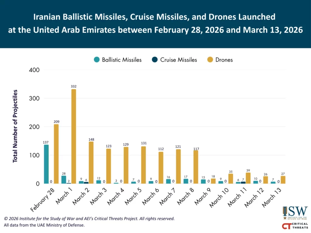 Iran continued to fire at the Gulf states on March 12 and 13, but Gulf air defense systems have largely intercepted Iranian projectiles. Iran has fired roughly 2,000 projectiles at the Gulf since the conflict started on February 28.[41] ISW-CTP only observed one impact in the Gulf states between 3:00 PM ET on March 12 and 3:00 PM ET on March 13. An Iranian drone struck the al Awhi Industrial Zone in Sohar, Oman, on March 13, killing two workers.[42] Saudi Arabia reported that it intercepted 51 Iranian drones on March 13.[43] The Kuwaiti Army reported that it detected one Iranian ballistic missile on March 13, which fell outside ”the threat area.”[44] The Emirati Defense Ministry reported that it intercepted seven Iranian ballistic missiles and 27 Iranian drones on March 13.[45] Iranian drones and missiles targeting the UAE have decreased relative to the peak of attacks since March 8, however (see graphic below). US Secretary of Defense Pete Hegseth stated on March 13 that Iranian missile volume is down 90 percent and one-way attack drone volume is down 95 percent since the start of the war.[46]
