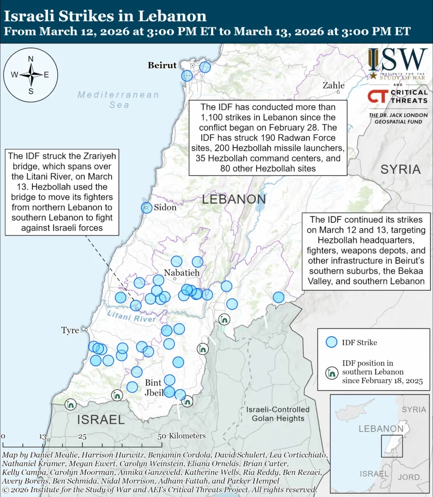 The IDF has continued to conduct airstrikes targeting Hezbollah across Lebanon. The IDF has conducted over 1,100 strikes in Lebanon since the conflict began on February 28.[57] The IDF has struck 190 Radwan Force sites, 200 Hezbollah missile launchers, 35 Hezbollah command centers, and 80 other Hezbollah sites.[58] The IDF has also killed over 380 Hezbollah fighters.[59] The IDF continued its strikes on March 12 and 13, targeting Hezbollah headquarters, fighters, weapons depots, and other infrastructure in Beirut’s southern suburbs, the Bekaa Valley, and southern Lebanon.[60] The IDF struck the Zrariyeh bridge, which spans the Litani River, on March 13.[61] The IDF stated that Hezbollah used the bridge to move its fighters from northern to southern Lebanon to fight against Israeli forces.[62] The IDF added that Hezbollah positioned launchers near the bridge and conducted launches against Israel from there.[63] The IDF also killed Hezbollah Unit 127 operative Murtada Hussein Srour in an airstrike in Beirut on March 13.[64] Unit 127 is Hezbollah’s aerial unit responsible for developing, producing, and launching attack drones.[65] The IDF stated that Srour was a prominent figure and a ”center of knowledge” in weapons manufacturing within Hezbollah.[66]