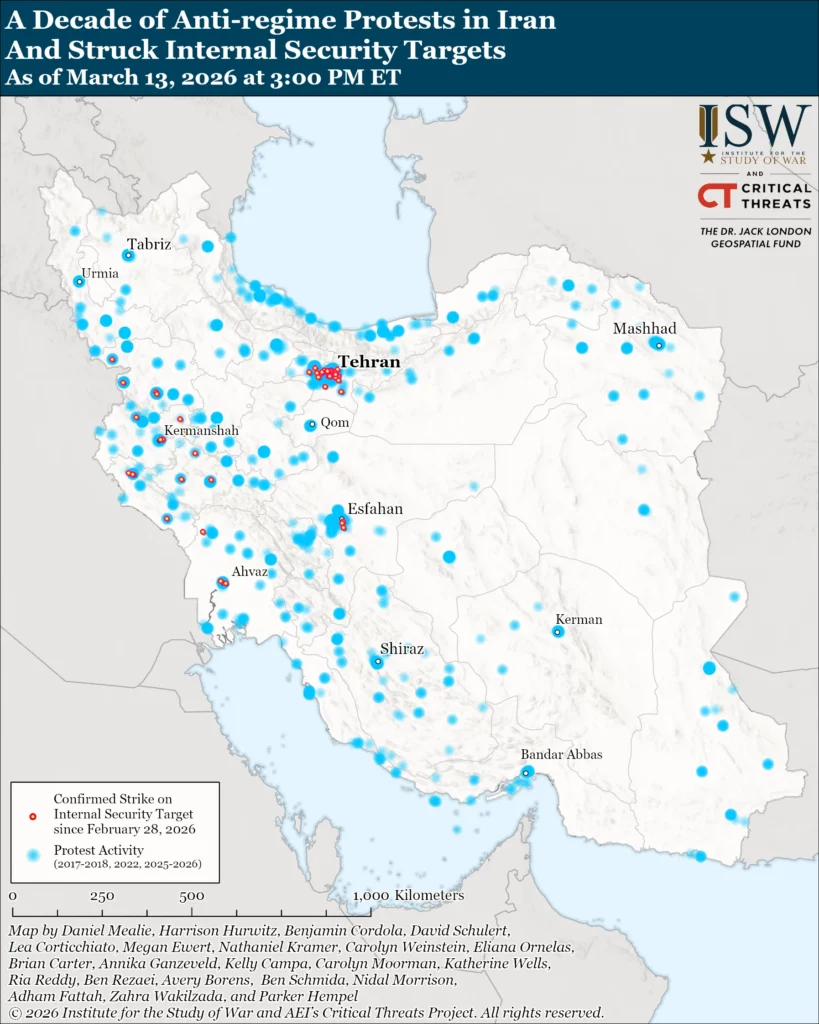 The US-Israeli combined force continued to target Iranian internal security infrastructure on March 13 in order to degrade the regime’s repressive capabilities. Israeli Prime Minister Benjamin Netanyahu stated on March 12 during his first press conference since the war started that Israel is “creating the optimal conditions for toppling the regime.”